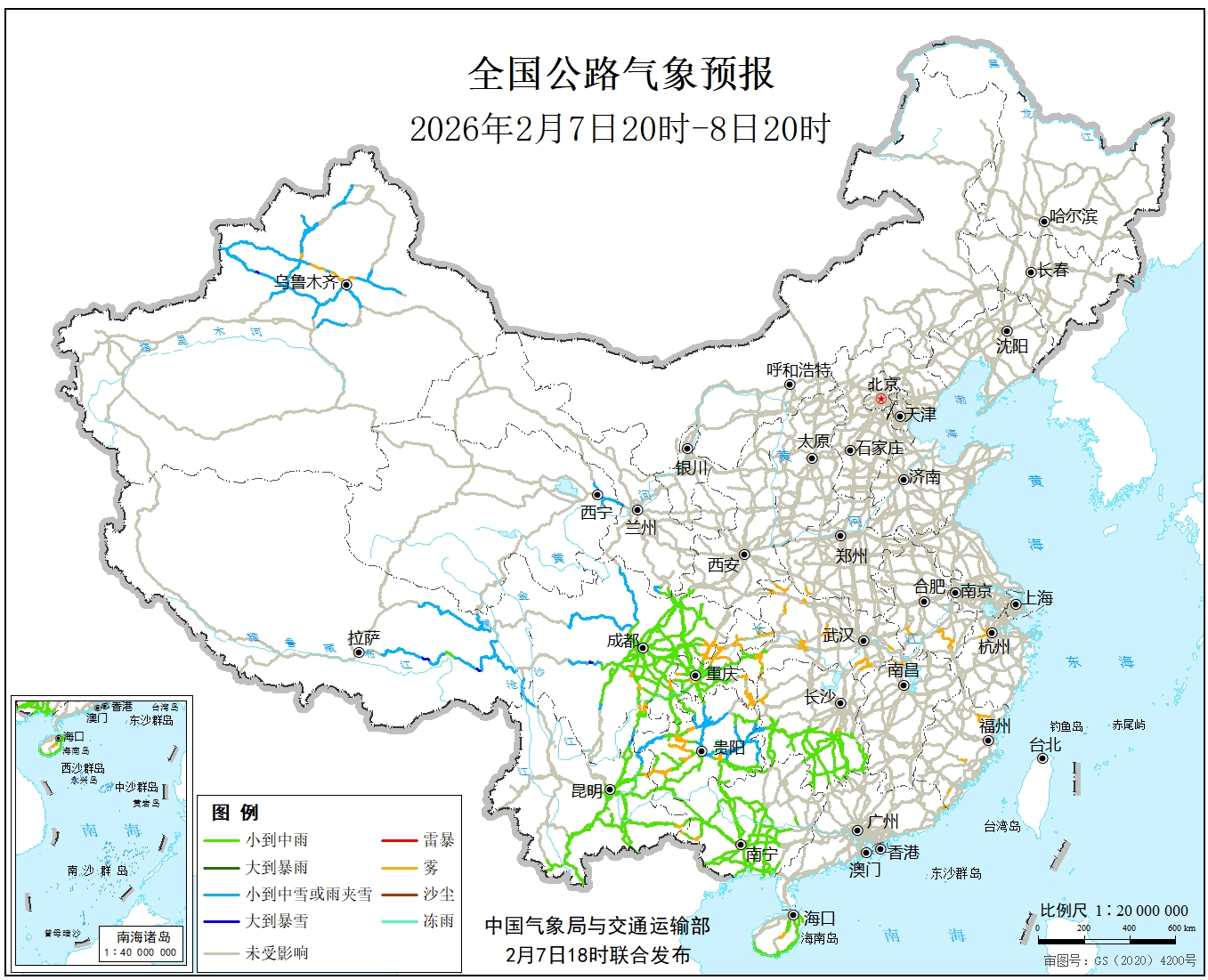 中国气象局与交通运输部2026年02月07日联合发布全国主要公路气象预报