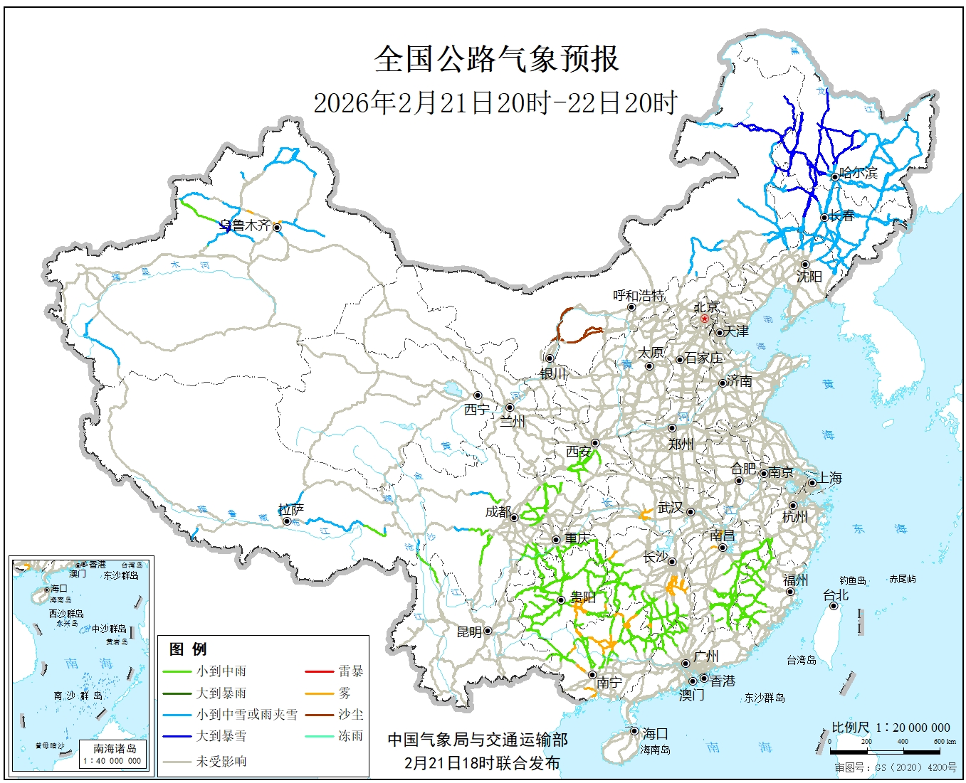 中国气象局与交通运输部2026年02月20日联合发布全国主要公路气象预报