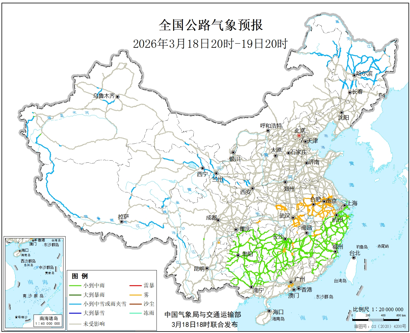 中国气象局与交通运输部2026年03月18日联合发布全国主要公路气象预报