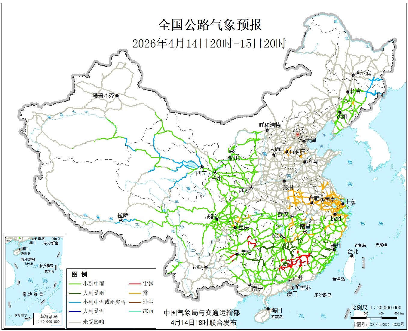 中国气象局与交通运输部2026年04月14日联合发布全国主要公路气象预报