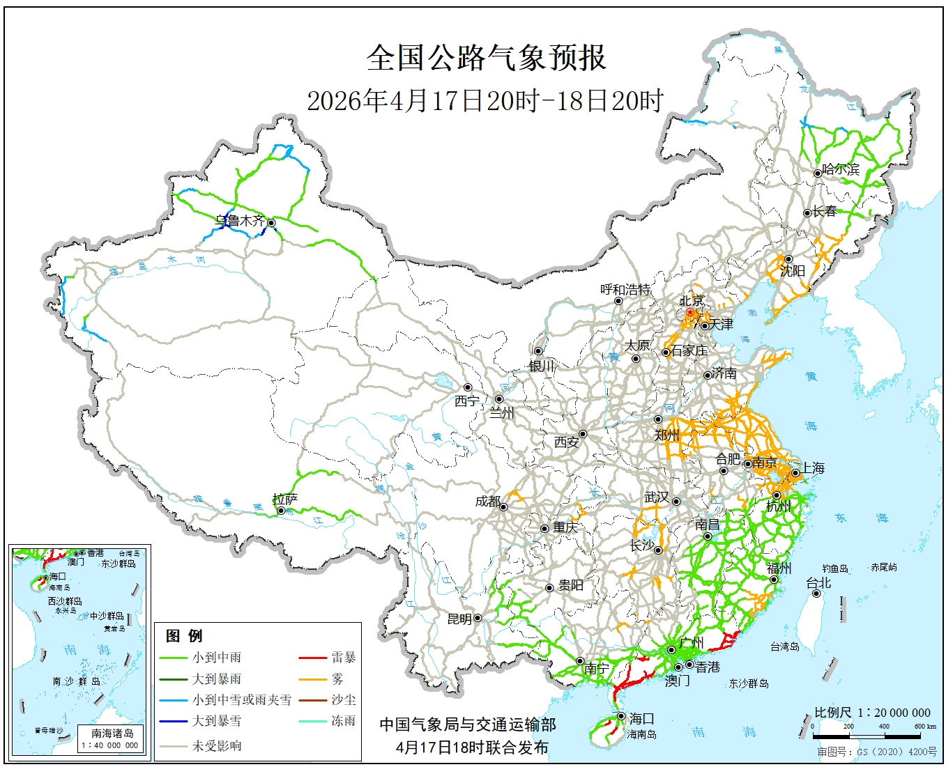 中国气象局与交通运输部2026年04月17日联合发布全国主要公路气象预报