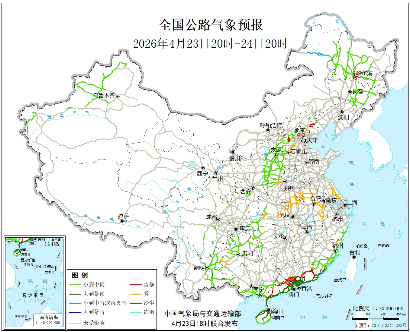 中国气象局与交通运输部2026年04月23日联合发布全国主要公路气象预报