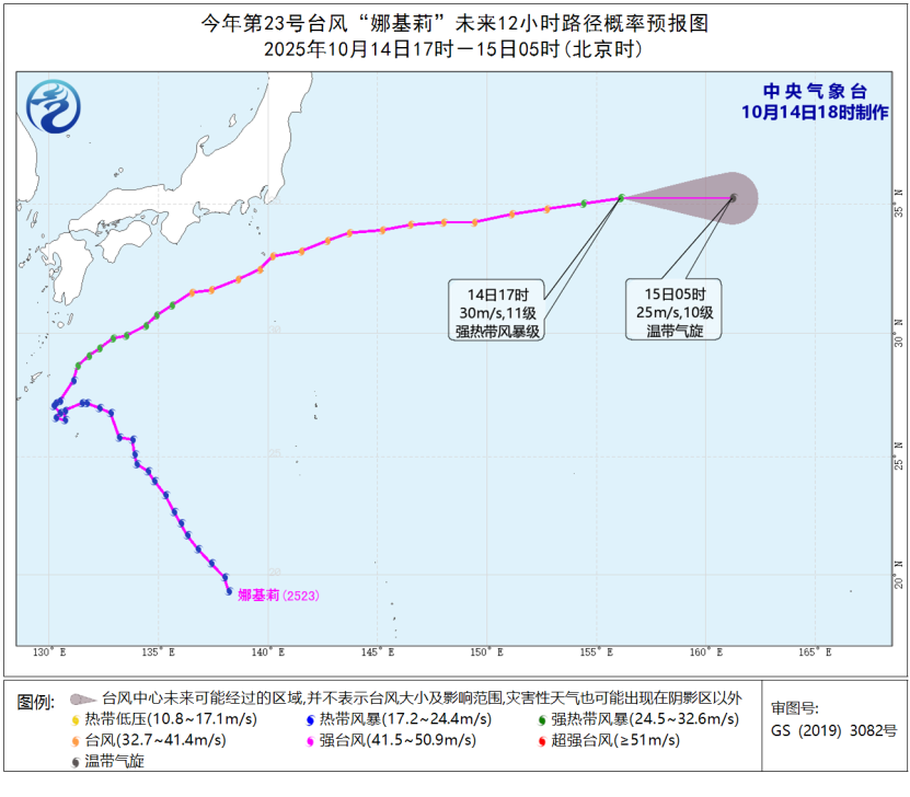 预计,“娜基莉”将以每小时35-40公里的速度向偏东方向快速移动,即将变性为温带气旋。未来“娜基莉”对我国无影响。