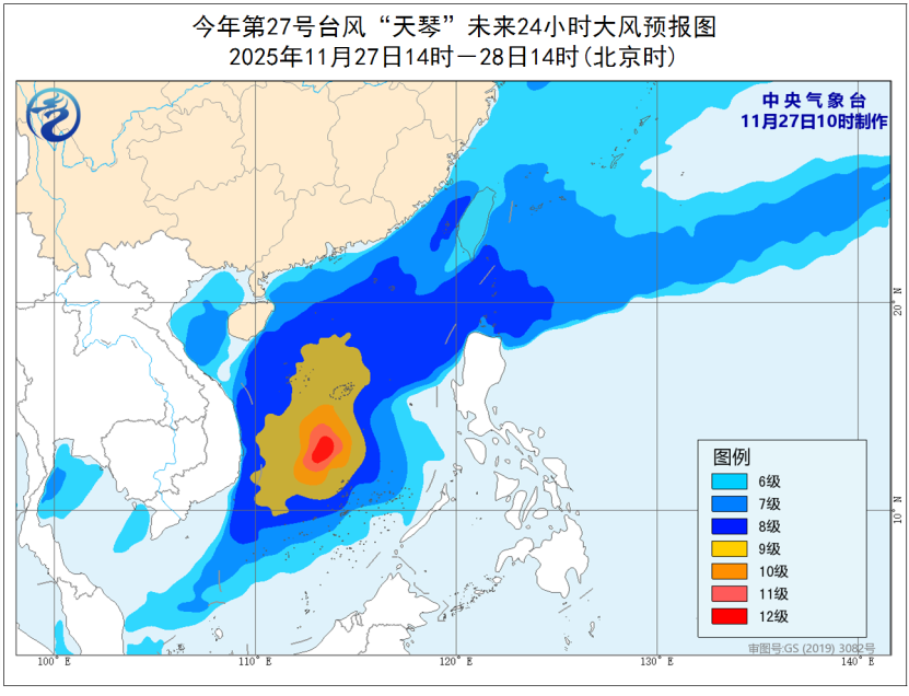 大风预报:27日14时至28日14时,受台风和冷空气的共同影响,台湾海峡、巴士海峡、台湾以东洋面、南海大部及东沙群岛、西沙群岛、中沙群岛、南沙群岛、黄岩岛附近海域、北部湾、台湾沿海、福建沿海、广东沿海、海南岛东部沿海将有6-8级大风,其中南海中部和南部部分海域风力可达9-10级,“天琴”中心经过的附近海域风力可达11-12级,阵风13-14级。