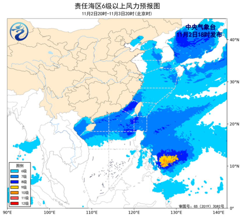 受冷空气影响,11月2日夜间至5日,黄海、东海海域将有5~7级、阵风8级的偏北风,台湾海峡将有7~8级、阵风9~10级的东北风,南海北部和中部海域将有5~7级、阵风8~9级的偏东到东北风。
