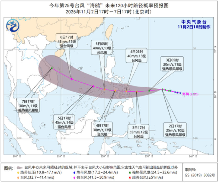 另外,今年第25号台风“海鸥”已于今天(2日)上午加强为强热带风暴级,8点钟其中心位于菲律宾马尼拉东偏南方向大约1550公里的西北太平洋洋面上,就是北纬10.9度、东经134.8度,中心附近最大风力有10级(25米/秒),中心最低气压为985百帕,七级风圈半径120-180公里。预计,“海鸥”将以每小时25公里左右的速度向偏西方向移动,4日穿过菲律宾中部,5日移入南海东部海面上,强度逐渐加强,最强可达台风级或强台风(40-48米/秒,13-15级),逐渐趋向越南中南部沿海(见图2)。