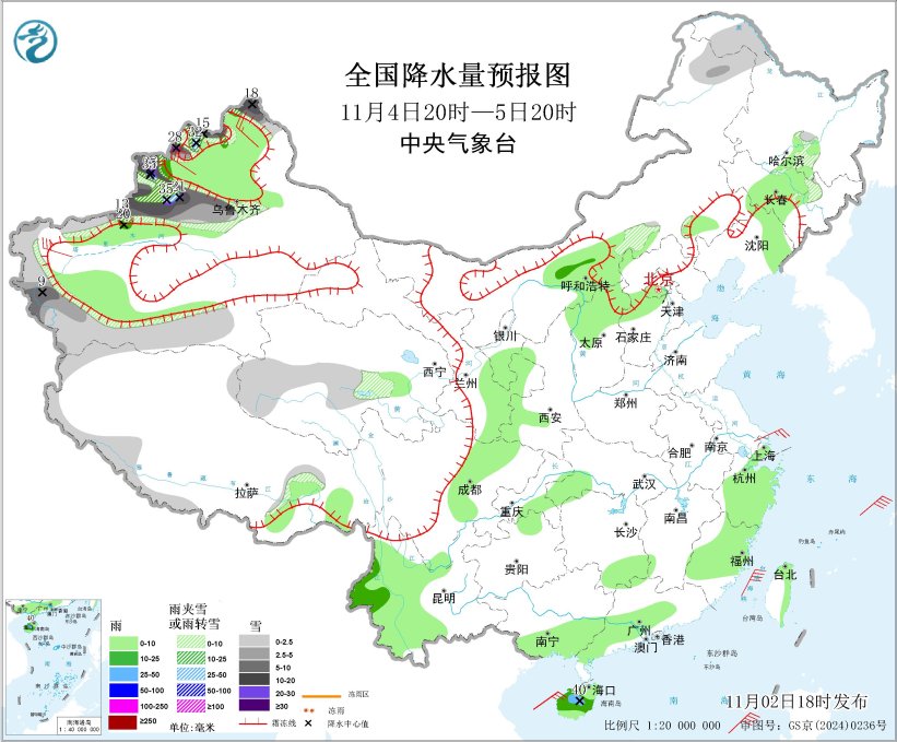 11月4日20时至5日20时,内蒙古东北部和中部、黑龙江西北部和中南部、新疆沿天山地区、伊犁河谷和南疆西部山区、西藏西部和中南部、青海中西部等地部分地区有小到中雪或雨夹雪,其中,新疆北疆北部和伊犁河谷等地部分地区有大到暴雪,局地大暴雪(20~28毫米),新增积雪深度4~12厘米,局地15厘米以上。新疆北部和西部、青海中部、内蒙古中部、山西北部、河北中部、吉林中部、辽宁东部、宁夏南部、甘肃东部、陕西北部和西南部、四川北部、湖北西南部、云南西部、广西南部、广东西部和北部、江西南部、福建中北部、浙江南部、海南岛以及台湾岛东部等地部分地区有小到中雨,其中,新疆北疆西部、海南岛中西部等地部分地区有大雨(25~40毫米)。新疆沿天山地区和南疆盆地等地部分地区有4~6级风;东海、南海、台湾海峡、巴士海峡、北部湾等部分海域有5~7级风,阵风8级,其中,南海东南部海域有8~10级风、阵风11级(见图5)。