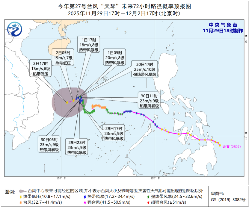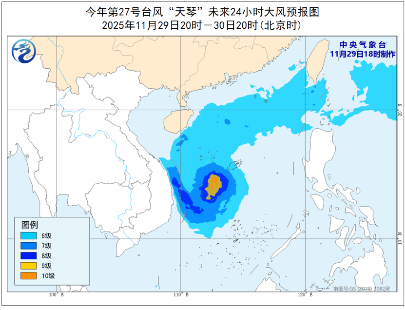 今年第27号台风“天琴”已于今天(29日)下午由强热带风暴级减弱为热带风暴级,下午5点钟其中心位于海南省三沙市(西沙永兴岛)偏南方向大约375公里的南海西南部海面上,就是北纬13.5度、东经112.0度,中心附近最大风力有9级(23米/秒),中心最低气压为990百帕,七级风圈半径160~200公里。预计,“天琴”将在南海西南部海面回旋少动,强度逐渐减弱,2日夜间将在南海西南部海域减弱消散(见图4)。29日20时至30日20时,巴士海峡、南海西部和东北部及东沙群岛、西沙群岛、中沙群岛将有6~7级、阵风8级大风,其中,南海西南部和中西部的部分海域风力可达8级,阵风9级,“天琴”中心经过的附近海域风力可达9~10级,阵风11~12级(见图5),中央气象台11月29日18时继续发布台风蓝色预警。西沙群岛、中沙群岛、黄岩岛附近海域将有小到中雨,局地大雨。
