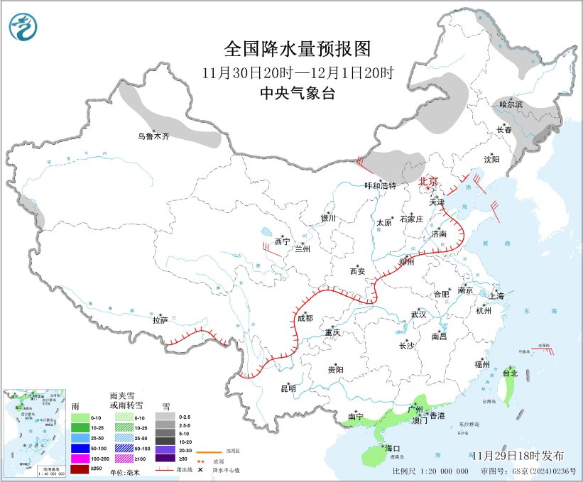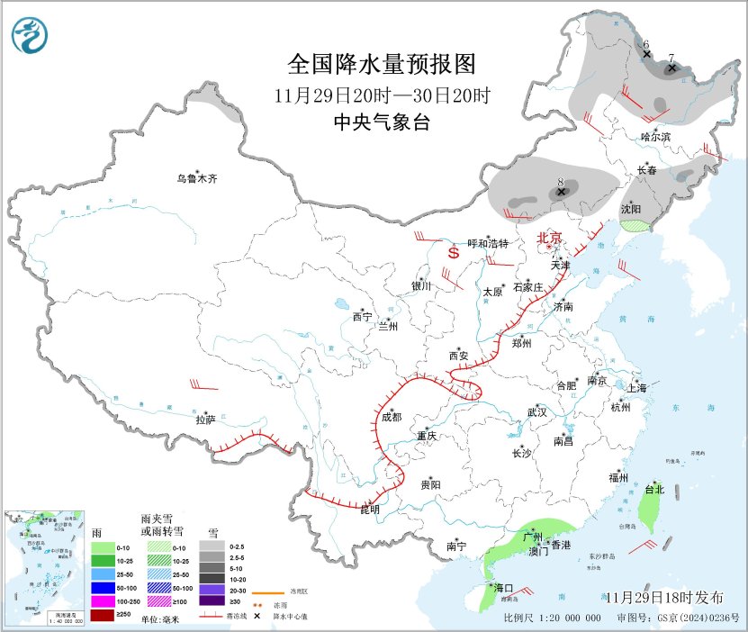 图6 全国降水量预报图(11月29日20时-30日20时)