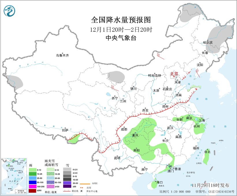 图7 全国降水量预报图(11月30日20时-12月1日20时)
