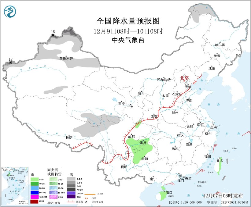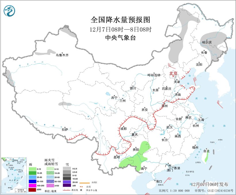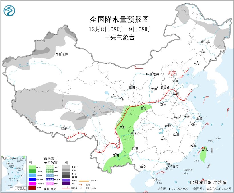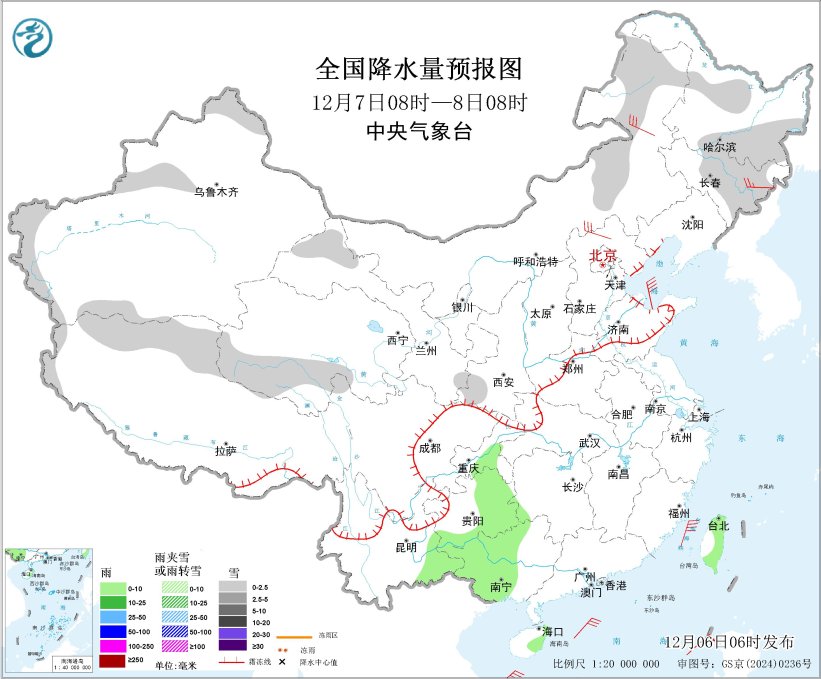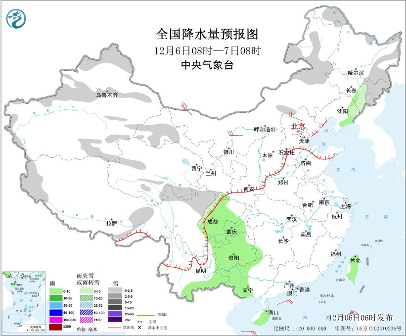 图1 全国降水量预报图(12月6日08时-7日08时)