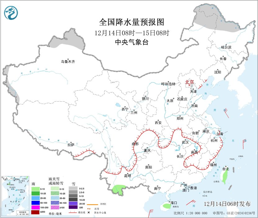 图2 全国降水量预报图(12月14日08时-15日08时)