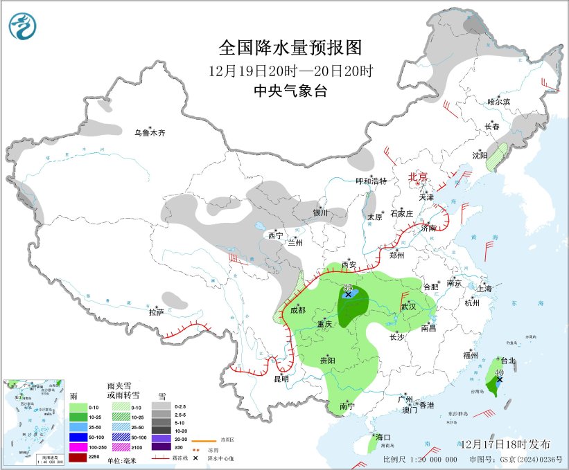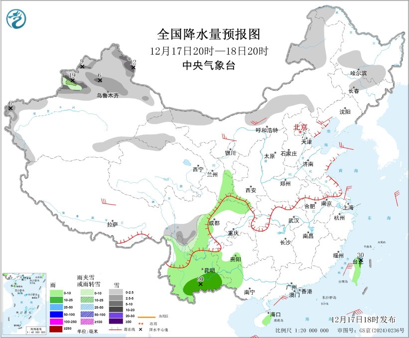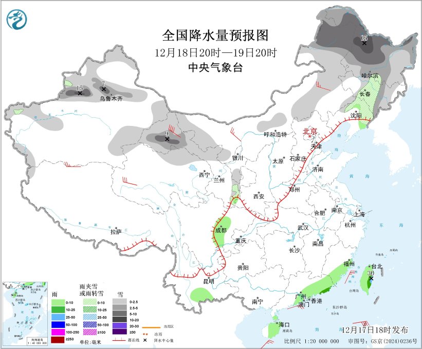 图2 全国降水量预报图(12月17日20时-18日20时)