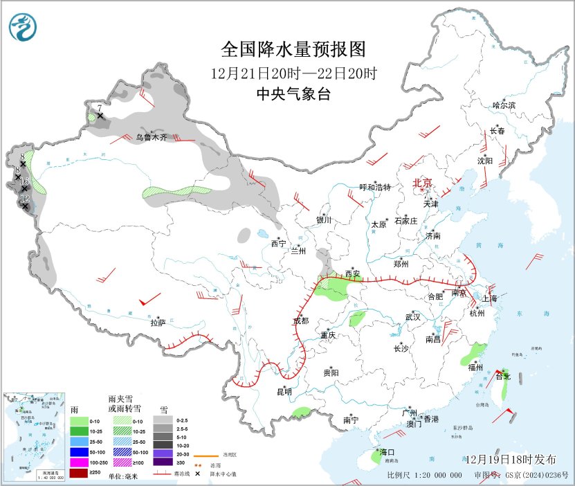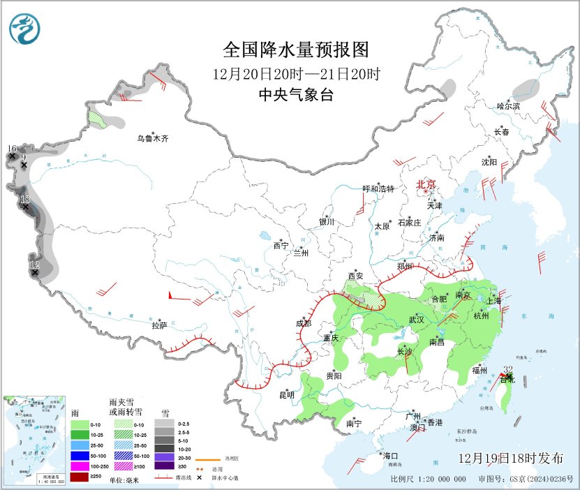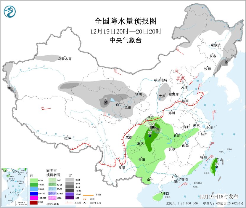 12月19日20时至20日20时,内蒙古东北部、东北地区东部和北部、新疆南疆西部山区、青海北部、甘肃、宁夏、山西中部、陕西南部、重庆东北部、湖北西部山区等地部分地区有小到中雪或雨夹雪,其中,新疆南疆西部山区、青海东部、湖北西部山区、重庆东北部等地局地有大到暴雪(10~16毫米)。江汉大部、江南北部和西部、西南地区东部、广西西部、海南岛、台湾岛等地部分地区有小到中雨,其中,重庆中东部、台湾岛东部等地局地有大雨(25~38毫米)。内蒙古、华北北部、西藏北部、青海中南部等地部分地区有4~6级风。东部和南部海域有7级风、阵风8级(见图2)。