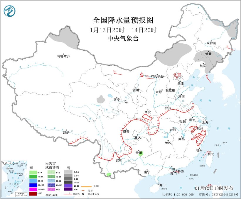 图2 全国降水量预报图(1月13日20时-14日20时)
