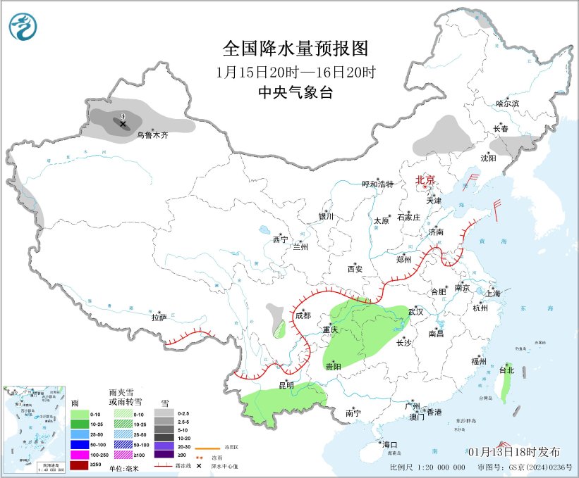 图1 全国降水量预报图(1月13日20时-14日20时)