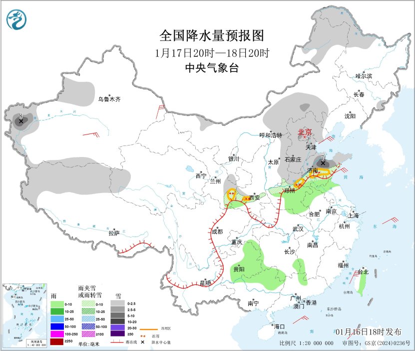 图3 全国降水量预报图(1月16日20时-17日20时)