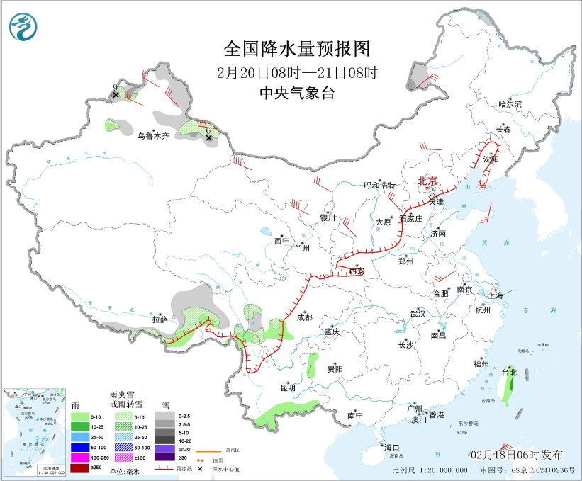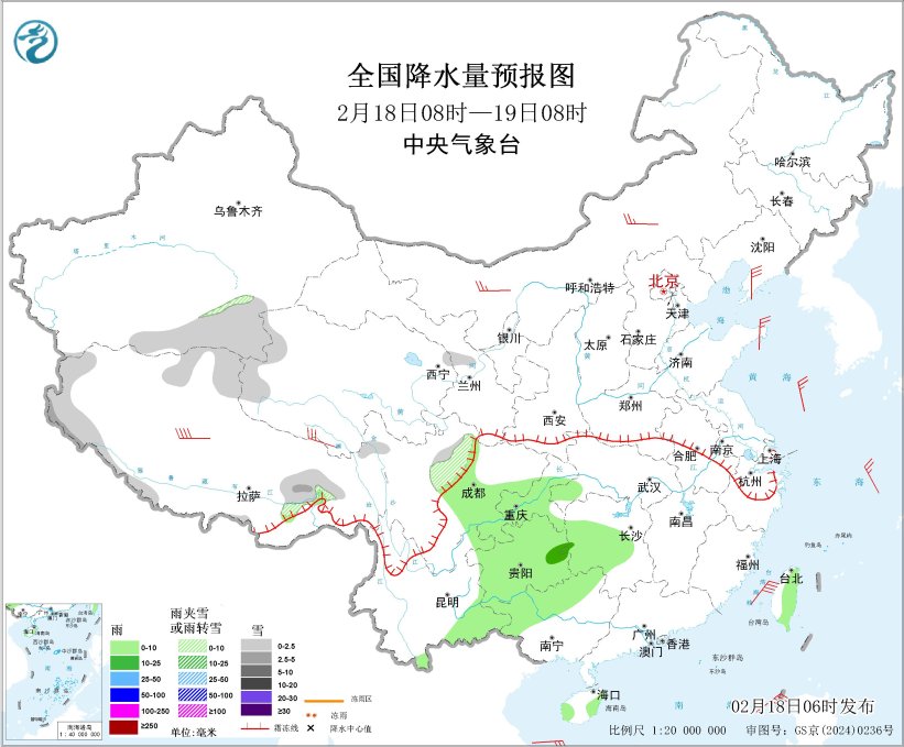 图1 全国降水量预报图(2月18日08时-19日08时)