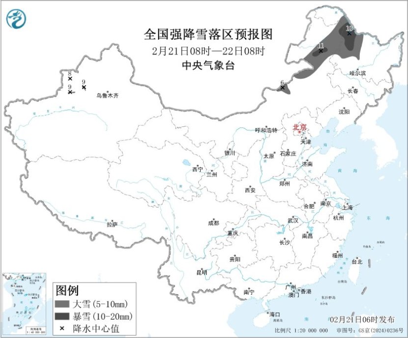 预计2月21日08时至2月22日08时,内蒙古中部和东北部、黑龙江西部等地部分地区有大雪,其中,内蒙古东北部、黑龙江西北部等地部分地区有暴雪(10~18毫米)。上述部分地区新增积雪深度8~10厘米,局地可达15厘米以上(见图5),中央气象台2月21日06时发布暴雪蓝色预警。