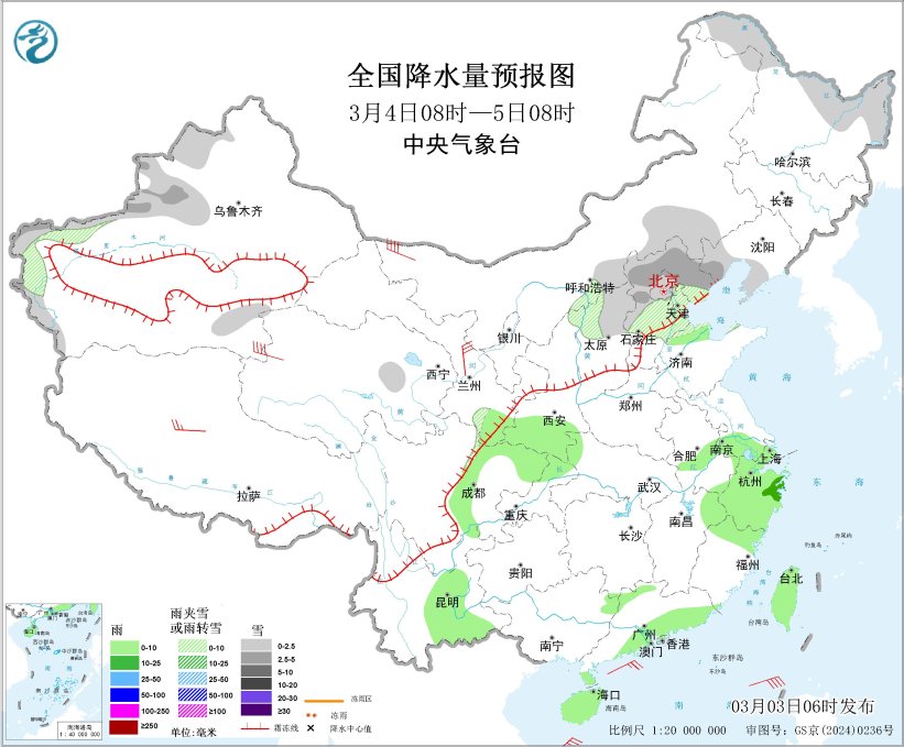 3月4日08时至5日08时,内蒙古中部、华北中北部、陕西北部、黑龙江北部、辽宁南部和西部、新疆伊犁河谷和西部山区等地部分地区有小到中雪或雨夹雪。甘肃东南部、陕西南部、四川盆地北部和西部、云南东南部和中部、安徽中部、江苏南部、上海、浙江、福建北部、江西东北部、广东中南部、海南岛、台湾岛等地部分地区有小雨,局地有中雨。西藏北部、青海西部、甘肃河西、内蒙古西部等地部分地区有5~6级风,阵风7级;台湾海峡有6~8级风,阵风9级,巴士海峡、南海北部海域有5~7级风,阵风8级(见图4)。