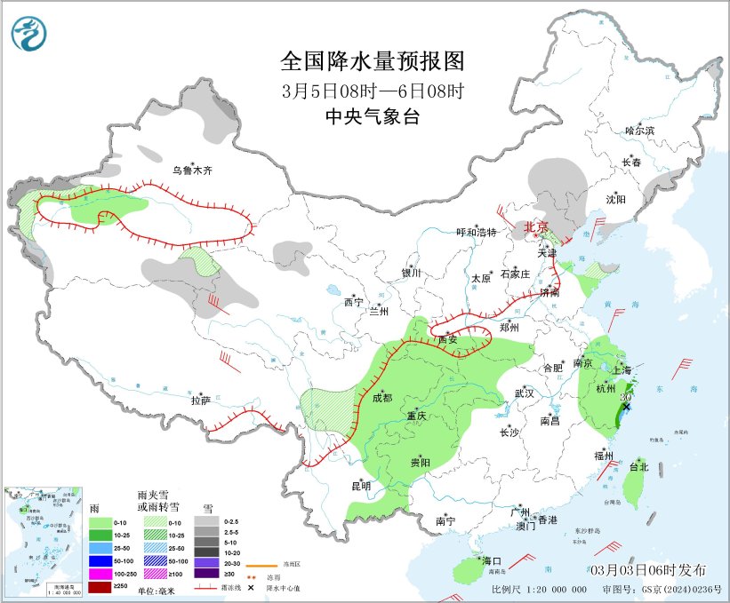 3月5日08时至6日08时,内蒙古东南部、吉林东部、辽宁南部和西部、华北北部、新疆北部和南疆西部山区、西藏北部、青海西部、川西高原南部、山东半岛东部等地部分地区有小雪或雨夹雪,其中,新疆北疆北部和南疆西部山区等地部分地区有中雪。甘肃东南部、陕西南部、四川中东部、云南东部、贵州大部、重庆、湖南西北部、湖北西部、河南南部、安徽东南部、江苏南部、上海、浙江、海南岛、台湾岛等地部分地区有小雨,其中,浙江中东部等地部分地区有中到大雨(25~30毫米)。河北北部部分地区有4~6级风,西藏北部、青海西部等地部分地区有6~7级风;东海西部、台湾海峡、南海北部海域有5~7级风,阵风8级(见图5)。