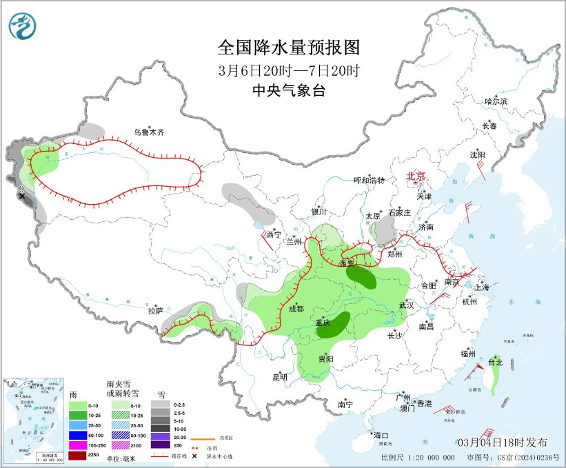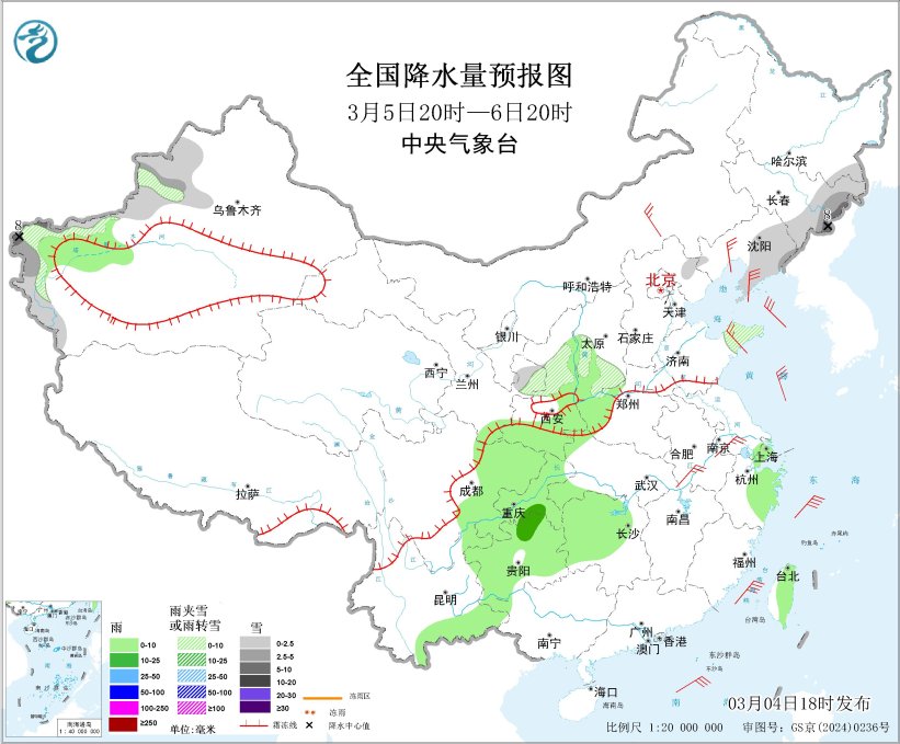 图1 全国降水量预报图(3月4日08时-5日08时)