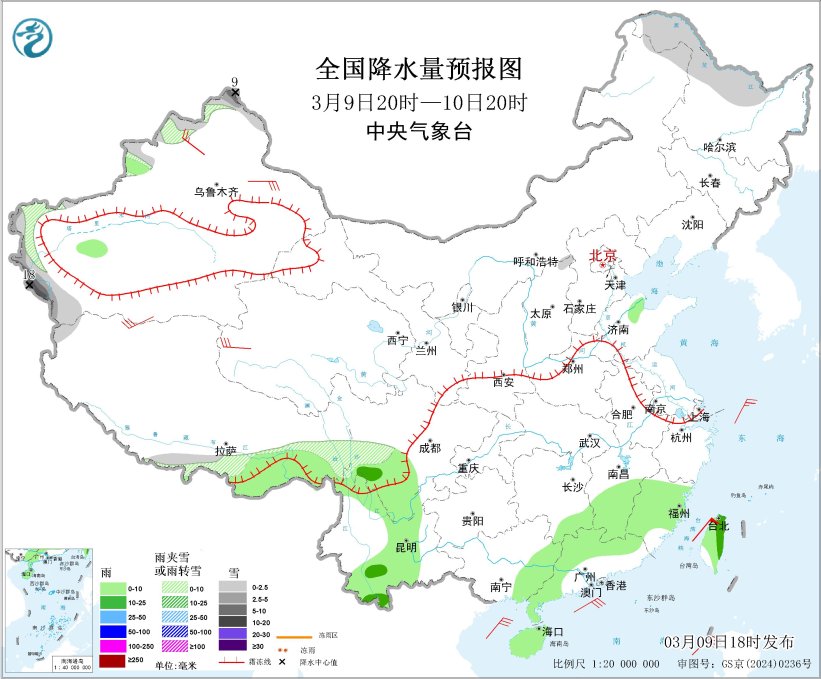 图1 全国降水量预报图(3月9日20时-10日20时)