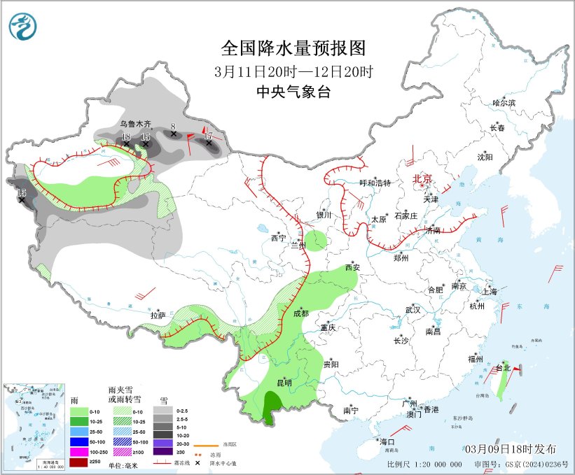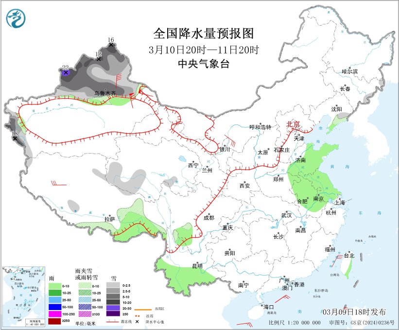 3月10日20时至11日20时,新疆北部和南疆西部山区等地部分地区有小到中雪或雨夹雪,其中,新疆北疆北部和沿天山一带、南疆西部山区等地部分地区有大到暴雪,局地大暴雪(20~22毫米)。西藏东南部、云南南部、山东大部、江苏、安徽、四川南部、台湾岛东部等地部分地区有小雨。内蒙古西南部、新疆东部、西藏西部、甘肃河西等地部分地区有4~6级风;台湾海峡、巴士海峡、南海西部、东北部和南海中东部海域将有5~6级大风、阵风7级(见图2)。