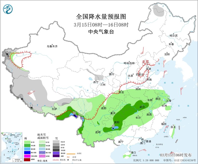 3月15日08时至16日08时,新疆南疆西部山区、西藏大部、川西高原西部、青海东北部、甘肃中部、内蒙古东北部、黑龙江西北部等地部分地区有小雪或雨夹雪,其中,新疆南疆西部山区、西藏南部和东北部等地部分地区有中到大雪,西藏西南部局地有暴雪(10~15毫米)。西藏东南部、西南地区大部、江汉、江淮、黄淮南部、江南中西部、陕西南部、广西西北部等地部分地区有小到中雨,其中,贵州南部、西藏东南部等地部分地区有大雨或暴雨(50~80毫米)。内蒙古中部、辽东半岛、山东半岛等地部分地区有4~6级风,西藏西部部分地区有6~7级风(见图1)。