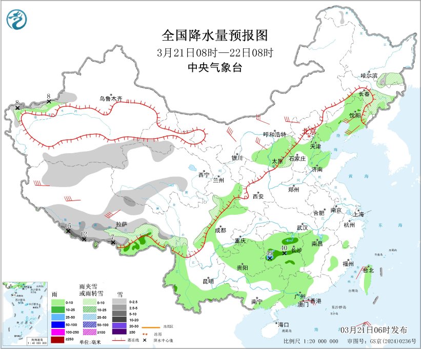 3月21日08时至22日08时,新疆南疆西部和南部山区、西藏南部和北部、青海西南部、甘肃河西、辽宁东北部、吉林东部、黑龙江东南部等地部分地区有小到中雪或雨夹雪,其中,新疆南疆西部山区、西藏西南部等地部分地区有大到暴雪(10~15毫米);西藏东南部、甘肃南部、陕西北部、山西中北部、河北东部、山东北部、辽宁中西部、四川盆地和东南部、云南西部和南部、重庆南部、贵州大部、江南中西部、广西北部和东部、广东中西部、台湾岛等地部分地区有小到中雨,其中,湖南西部等地部分地区有大雨(25~45毫米)。内蒙古中部、河北北部、辽东半岛、西藏北部和西部等地部分地区有5~7级风;渤海、渤海海峡、台湾海峡将有5~6级风、阵风7级(见图1)。