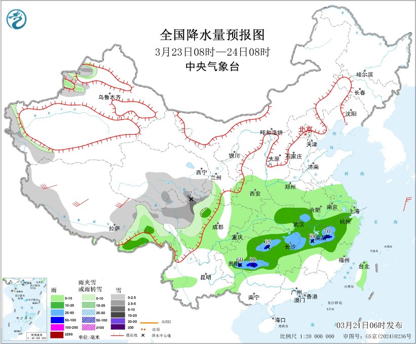 3月23日08时至24日08时,新疆伊犁河谷和南疆西部山区、西藏西部和东部、青海中南部、甘肃西南部、川西高原等地部分地区有小到中雪或雨夹雪,其中,青海东南部、川西高原北部等地局地有大雪(5~7毫米);江汉东部、江南中北部、西南地区东南部等地部分地区有中到大雨,其中,贵州东南部、湖南西部、江西北部等地局地有暴雨(50~80毫米)。西藏中北部有5~7级风(见图3)。