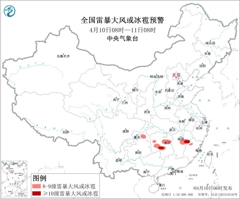 预计,4月11日20时至12日20时,浙江南部、江西中南部、福建西北部、湖南南部、广西东北部等地部分地区有大到暴雨,其中,江西中部等地局地有大暴雨(100~120毫米)(见图1);西南地区东部、江南中西部和东北部、华南北部等地的部分地区将有8级以上雷暴大风或冰雹天气;江南东部和南部、华南北部等地的部分地区将有小时雨量大于20毫米的短时强降水天气(见图2)。中央气象台4月11日18时继续发布暴雨蓝色和强对流天气蓝色预警。