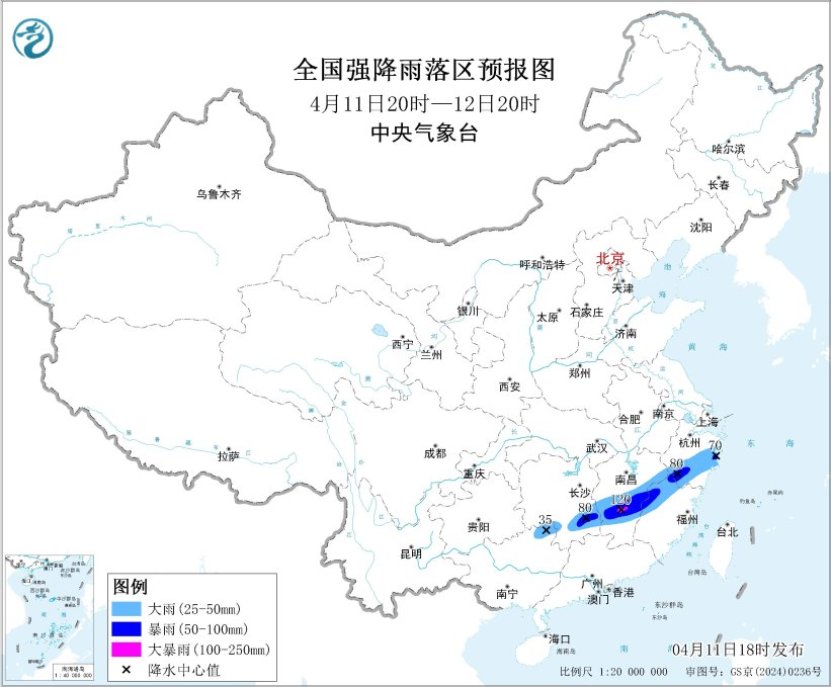 11日夜间至12日,江南南部和东部、华南北部等地的部分地区有中到大雨,局地暴雨或大暴雨,并伴有短时强降水、雷暴大风或冰雹等强对流天气。