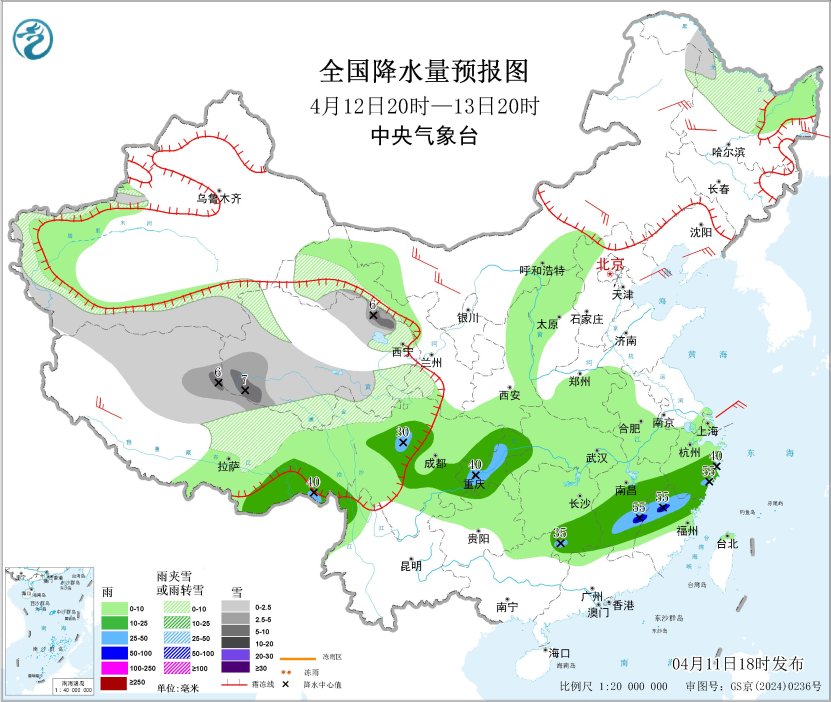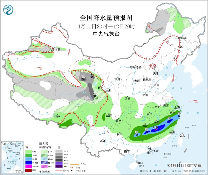 4月11日20时至12日20时,西藏北部、青海南部和东部、甘肃西南部和祁连山山区、川西高原北部、内蒙古东北部、黑龙江西北部、新疆天山西段高海拔地区等地部分地区有小到中雪或雨夹雪,其中,青海北部和东部等地部分地区有大雪,局地暴雪(10~13毫米);江南东部和南部、广西北部、广东北部、四川盆地西南部等地部分地区有中到大雨,其中,浙江南部、江西中南部、福建西北部、湖南东南部等地部分地区有暴雨或大暴雨(100~120毫米)。新疆东部、内蒙古大部、东北地区中南部等地部分地区有4~6级风,其中,新疆东部部分地区有6~7级风(见图3)。