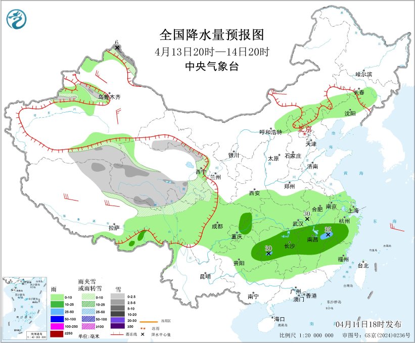 4月13日20时至14日20时,新疆北疆北部和沿天山地区、青海大部、西藏北部、川西高原北部、甘肃祁连山山区等地部分地区有小到中雪或雨夹雪;四川东部、重庆中部、贵州东部、江南中部和北部等地部分地区有中雨,其中,湖南西部、江西东北部部分地区有大雨(25~35毫米)。内蒙古大部、新疆大部、西藏西部等地部分地区有4~6级风(见图5)。