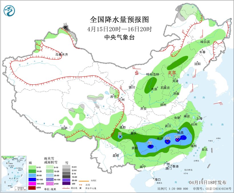 4月14日20时至15日20时,新疆南疆盆地南部高海拔地区、西藏南部、青海北部和南部、甘肃河西以及内蒙古东北部、黑龙江西北部和东南部、吉林东北部等地部分地区有小到中雪或雨夹雪。贵州东南部、重庆中部、江南中东部和南部、华南北部以及宁夏南部、西藏东南部等地部分地区有中到大雨,其中,湖南南部和西部、江西中部、广西东北部、广东西北部等地局地有暴雨或大暴雨(100~110毫米)。内蒙古中部和西北部、新疆东部、西藏北部、青海西部等地部分地区有4~6级风;北部湾将有5~6级风、阵风7级(见图1)。