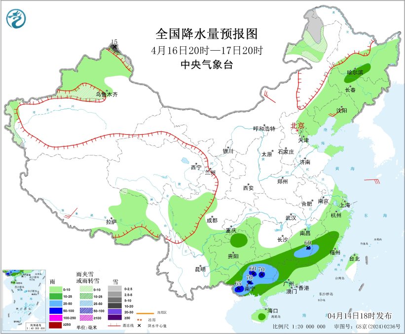 4月16日20时至17日20时,内蒙古东北部、新疆沿天山地区、北疆北部、南疆西部山区等地部分地区有小雪或雨夹雪,其中,新疆北疆北部等地部分地区有中到大雪,局地暴雪(10~15毫米);江南南部、华南西部等地部分地区有中到大雨,其中,江西南部、广西中部和西南部等地部分地区有暴雨(50~70毫米);内蒙古大部、辽宁中部、西藏南部等地部分地区有4~5级风;东海北部海域将有6~7级大风、阵风8级(见图3)。