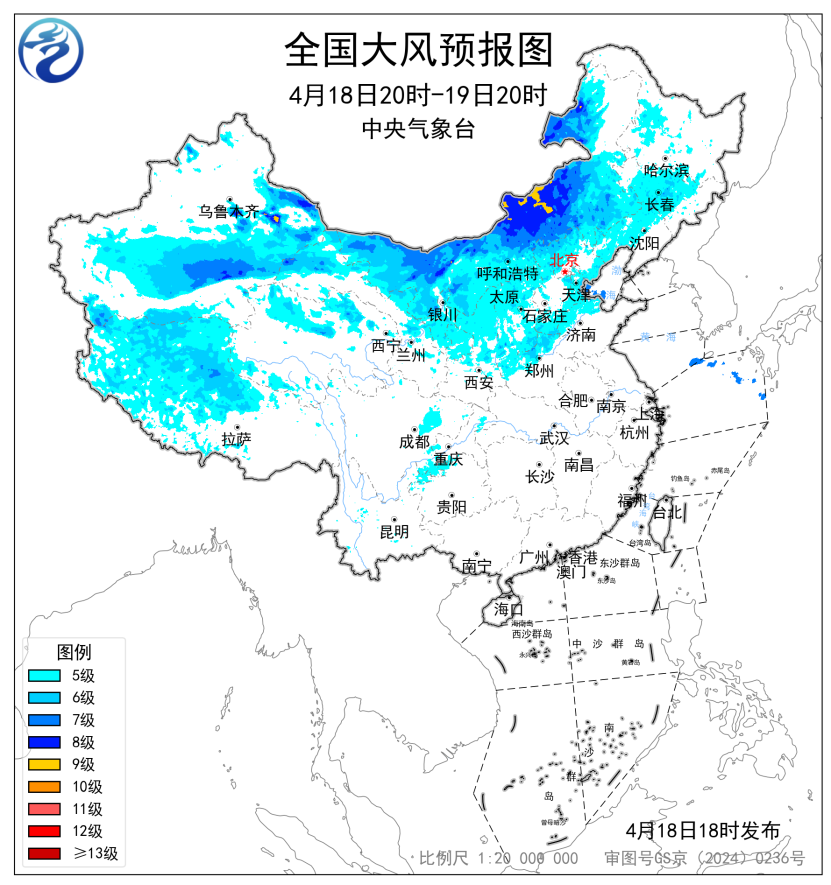 预计,4月19日20时至20日20时,新疆南疆东部和南疆盆地、西藏大部、青海西部、甘肃河西、内蒙古中东部、东北地区大部、山西北部、河北北部、北京、天津、黄淮大部、苏皖中北部等地部分地区有5~7级风,阵风8~9级,其中新疆东部山口、西藏北部、内蒙古中部局地有8~9级风,阵风10级以上;渤海、渤海海峡、黄海北部海域、黄海中西部和西南部部分海域将有7~8级、阵风9级的大风(见图3)。中央气象台4月19日18时继续发布大风黄色预警。