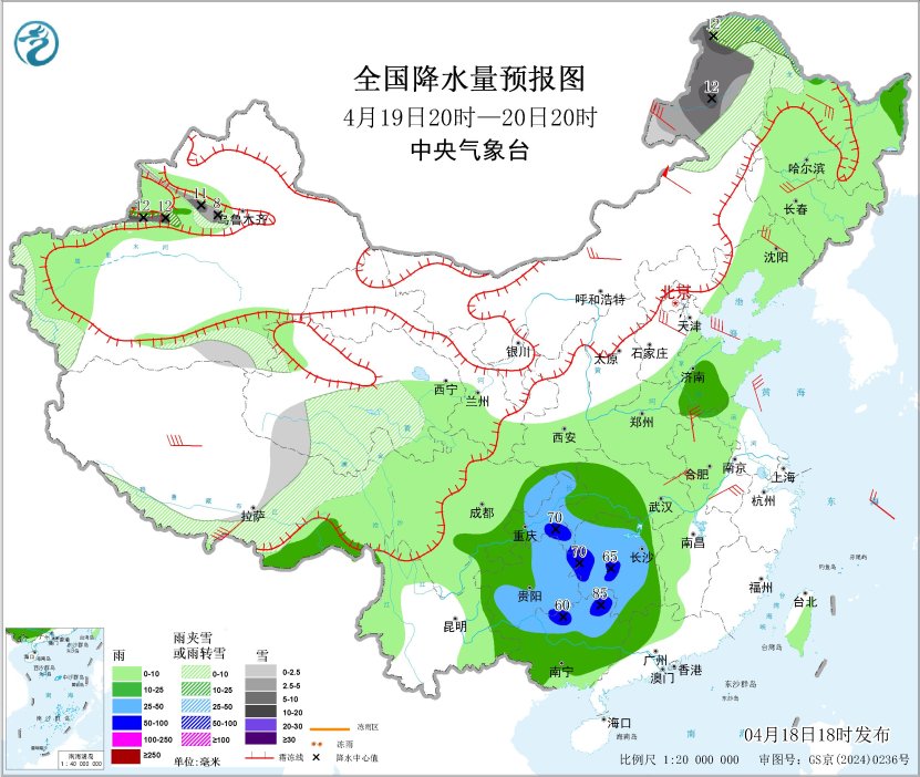 4月19日20时至20日20时,内蒙古东北部、黑龙江西北部、新疆沿天山西段和南疆高海拔山区、西藏北部和东部、青海西部和东部、甘肃西南部、川西高原北部等地部分地区有小到中雪或雨夹雪,其中,内蒙古东北部、黑龙江西北部等地部分地区有大到暴雪(10~13毫米);黑龙江东北部、黄淮中部、西南地区东部、江南中西部、华南中北部等地部分地区有中到大雨,其中,重庆中部和东南部、贵州北部和东部、湖南中西部和南部、广西东北部等地部分地区有暴雨或大暴雨(100~130毫米)。新疆南疆东部和南疆盆地、西藏大部、青海西部、甘肃河西、内蒙古中东部、东北地区大部、山西北部、河北北部、北京、天津、黄淮大部、苏皖中北部等地部分地区有5~7级风,阵风8~9级,其中新疆东部山口、西藏北部、内蒙古中部局地有8~9级风,阵风10级以上;渤海、渤海海峡、黄海北部海域、黄海中西部和西南部部分海域将有7~8级、阵风9级的大风(见图6)。