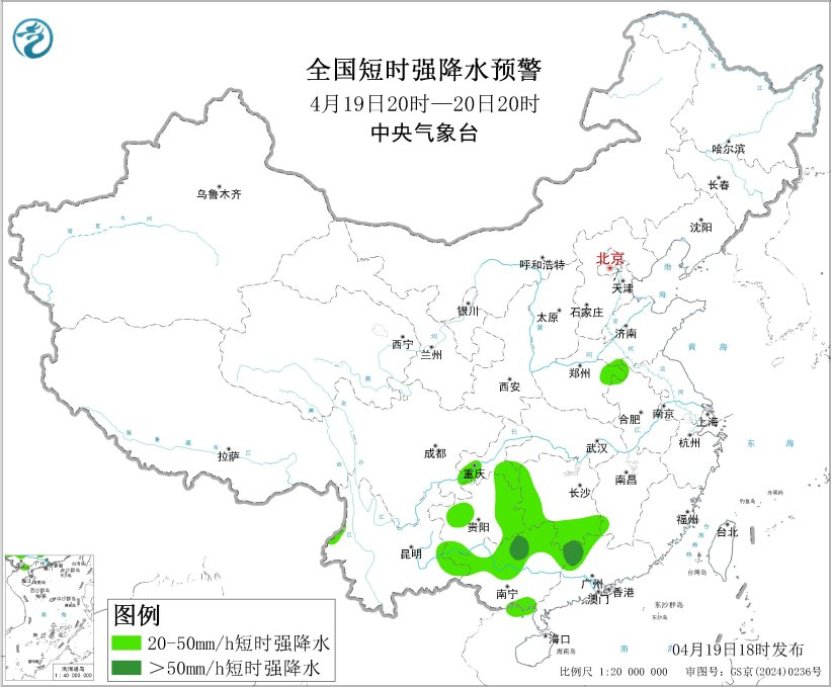 图2 全国短时强降水预警图(4月19日20时-20日20时)