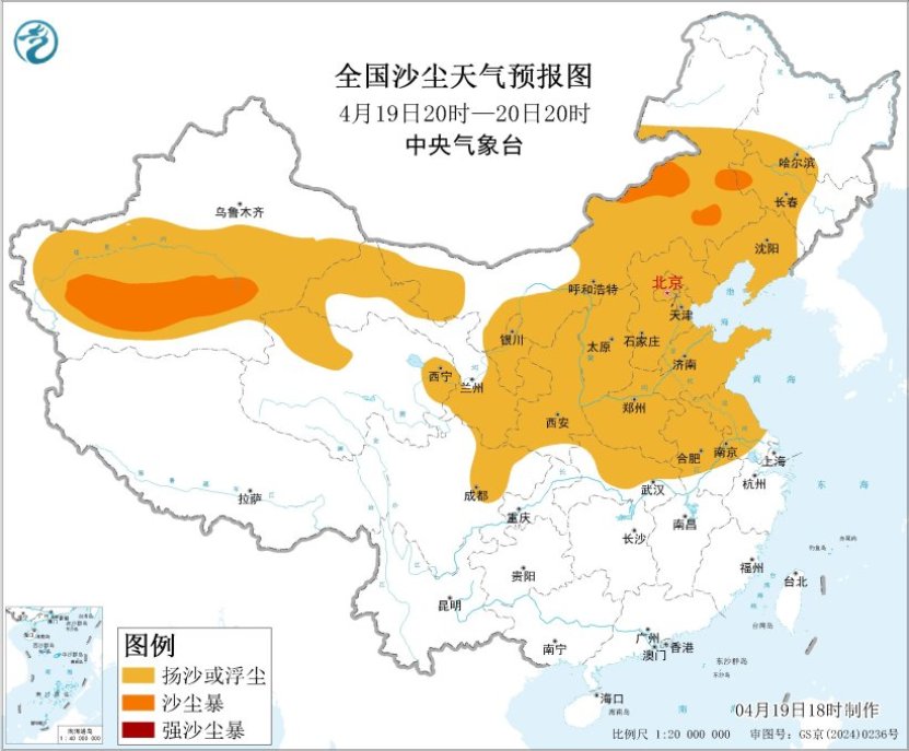 受冷空气大风影响,预计4月19日20时至20日20时,新疆东部和南部、青海西北部和东部、内蒙古中东部、甘肃中东部、宁夏、陕西、山西、北京、天津、河北、山东、河南、吉林中西部、辽宁、安徽中北部、江苏中北部、湖北北部、四川盆地北部等地的部分地区有扬沙或浮尘天气,其中,内蒙古中东部、新疆南部等地的部分地区有沙尘暴(见图4)。中央气象台4月19日18时继续发布沙尘暴蓝色预警。