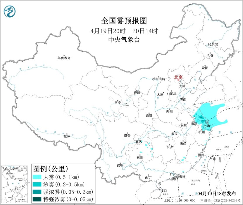 预计,19日夜间至20日上午,黄海南部海域、东海西北部海域、江苏东部沿岸海域、长江口及杭州湾附近海域将有能见度不足1公里的大雾。另外,江苏中南部、浙江北部等地的部分地区有大雾,局地有能见度不足200米的强浓雾(见图5)。中央气象台4月19日18时继续发布大雾黄色预警。