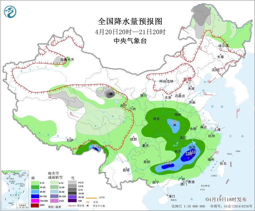 4月20日20时至21日20时,内蒙古东北部、黑龙江西北部、新疆沿天山地区、青藏高原东部和北部等地部分地区有小到中雪或雨夹雪,其中,青海北部局地有大到暴雪(10~13毫米);西藏东南部、西北地区东南部、黄淮西部、江汉大部、湖南东部、江西大部、华南北部等地部分地区有中到大雨,其中,西藏东南部、湖南南部、江西中南部、广西东北部等地部分地区有暴雨或大暴雨(100~120毫米)。新疆沿天山地区和南疆盆地、西藏大部、青海大部、内蒙古中东部、黑龙江南部、吉林、辽宁大部、云南东部等地部分地区有5~7级风,阵风8~9级,其中新疆沿天山地区、西藏北部、内蒙古中部局地有8~9级风;渤海、渤海海峡、黄海北部海域将有7级、阵风8~9级的大风(见图7)。
