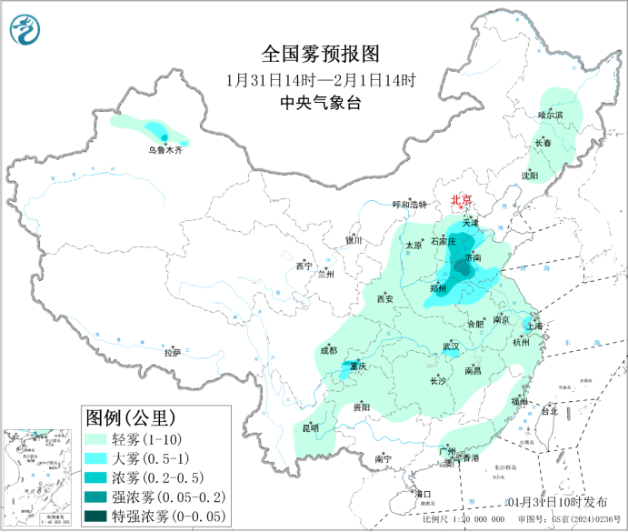 图1 全国雾预报图(1月31日14时-2月1日14时)