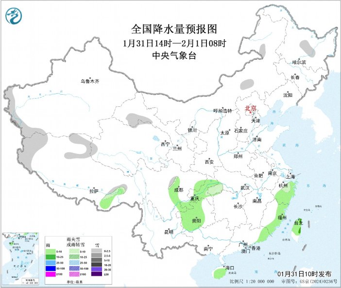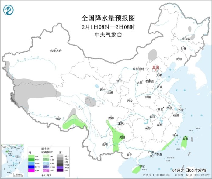 1月31日14时至2月1日08时,黑龙江中部、内蒙古东部、甘肃西部、新疆西南部、西藏西部和东南部、四川中部、湖北西南部、浙江中部等地部分地区有小雪或雨夹雪,其中,新疆南疆西部山区有中到大雪(5~8毫米);贵州西部、云南东北部高海拔山区局地有冻雨。江南东部、西南地区东部及广东东部、海南岛、台湾岛大部等地部分地区有小雨、局地中雨(见图2)。