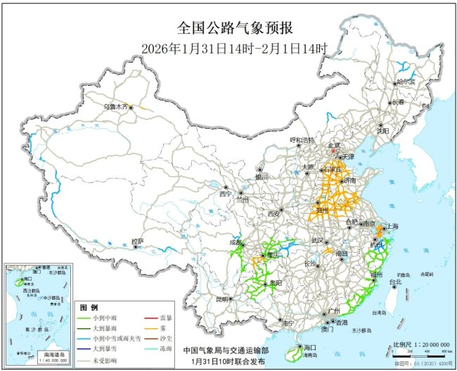 图4 全国公路气象预报图(1月31日14时至2月1日14时)