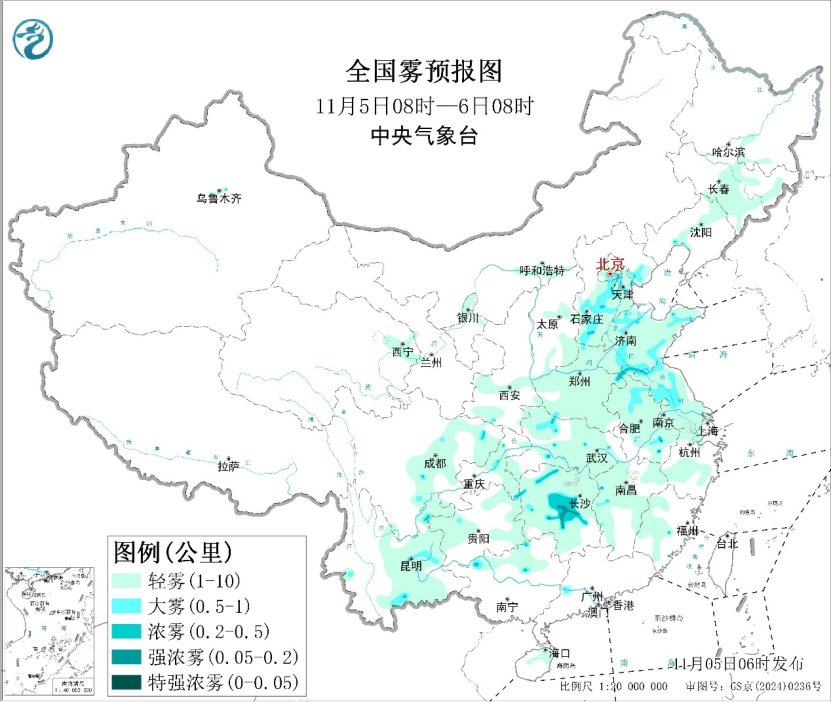 中央气象台今晨还发布了大雾黄色预警。预计,11月5日早晨至上午,北京东南部、天津中西部、河北中南部、山东西部和南部、江苏中北部、安徽北部、湖南中北部等地的部分地区有大雾,局地有能见度不足200米的强浓雾。