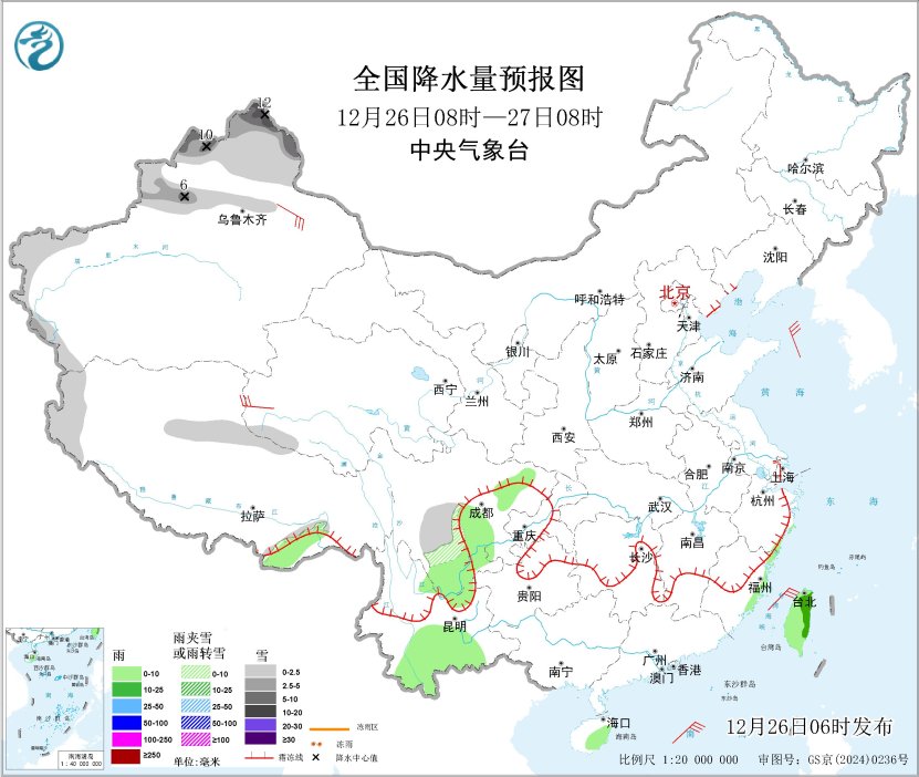 降水方面,未来三天我国大部地区降水较弱。26日,新疆北部将有小到中雪,局地大到暴雪。