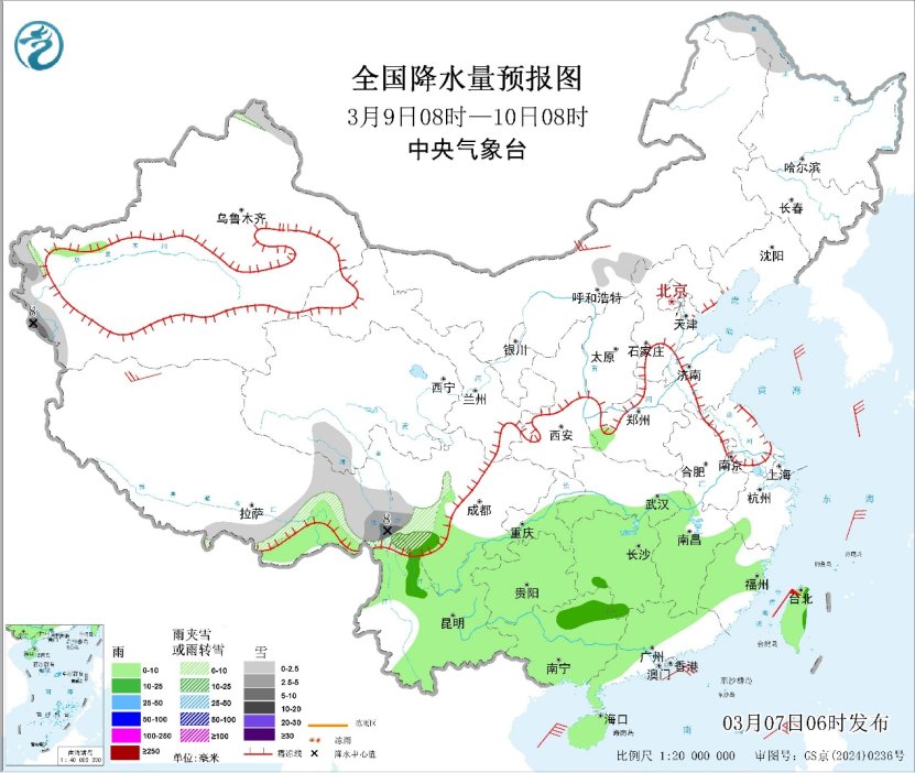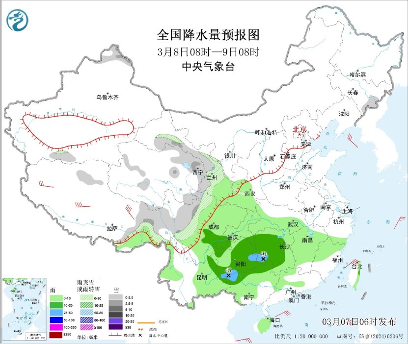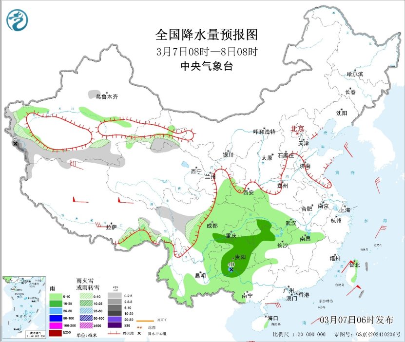 昨日,降水主要出现在新疆西部和北部、陕西、山西、河南等地,上述部分地区出现小到中雪或雨夹雪,山西和河南局地出现大到暴雪。预计未来三天,北方降雪减弱,南方大部地区多阴雨天气,其中,贵州南部和东部、湖南西部、广西西北部等地局地有大雨;新疆西部和北部、西北地区东部、川西高原、西藏东部等地部分地区有小到中雪或雨夹雪,局地大雪。