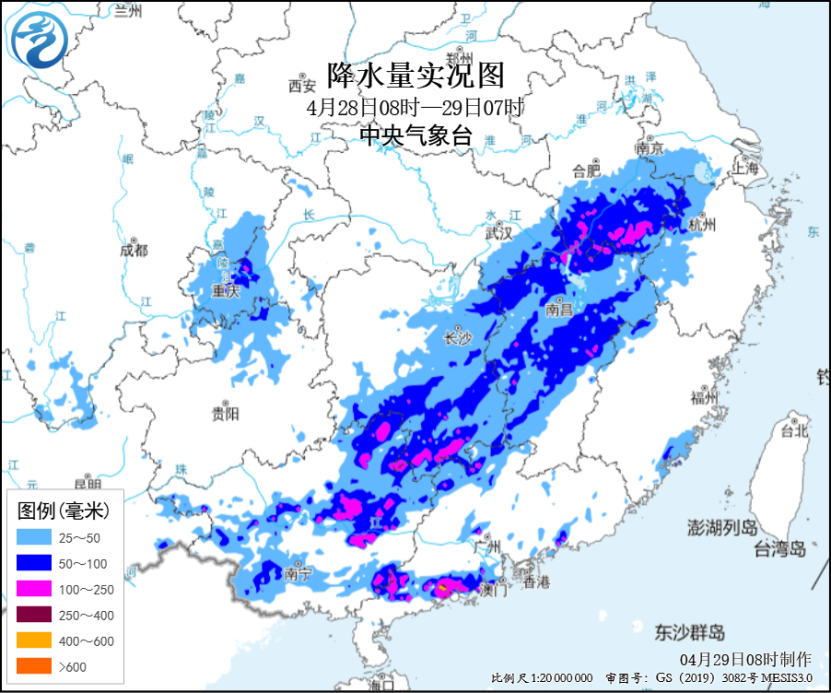 其中今天,重庆中部、云南东部、江淮南部、江南中西部、华南中西部等地部分地区有大到暴雨,安徽南部、江西北部、广西东北部、广东西北部等地部分地区有大暴雨(100~130毫米),上述部分地区伴有短时强降水(最大小时降雨量20~50毫米,局地可超过60毫米)。华南中西部、西南地区南部等地的部分地区将有8级以上雷暴大风或冰雹天气,广西东部和南部等地的部分地区将有10级以上雷暴大风,最大风力可达11级以上。中央气象台今晨继续发布暴雨黄色预警和强对流天气蓝色预警。